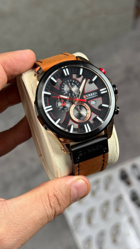 ساعت سه موتوره فعال برند کارن قطر ۴۵ میلی متر رنگ ثابت ضدآب قاب استیل بند چرم شیشه ضدخش روز شمار دارد ضدآب 3ATM باکس اصلی