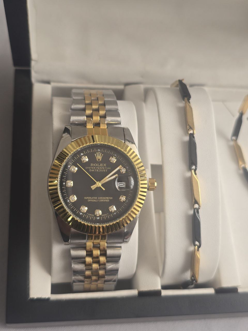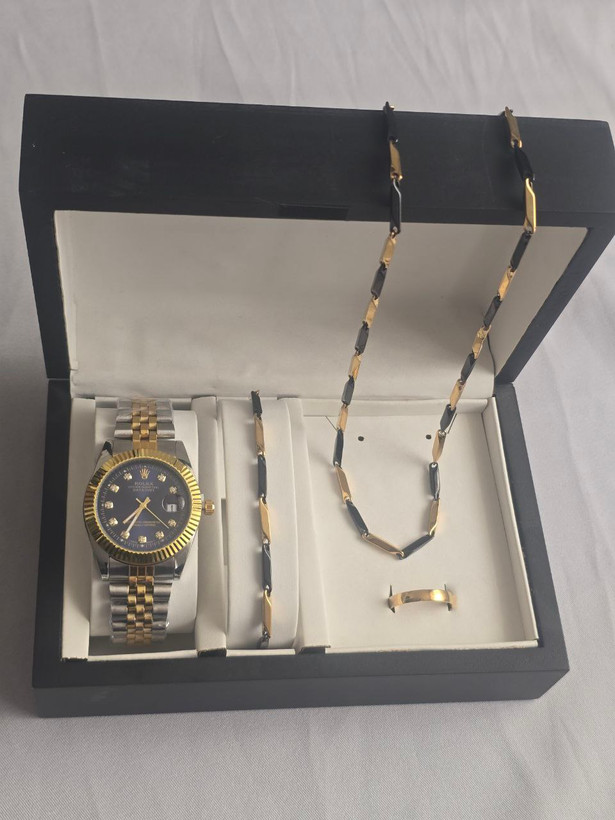 ست مردانه ساعت و دستبند و گردنبند استیل و حلقه( سایز ۶ تا ۱۰) بهمراه جعبه کادویی و باتری یدکی