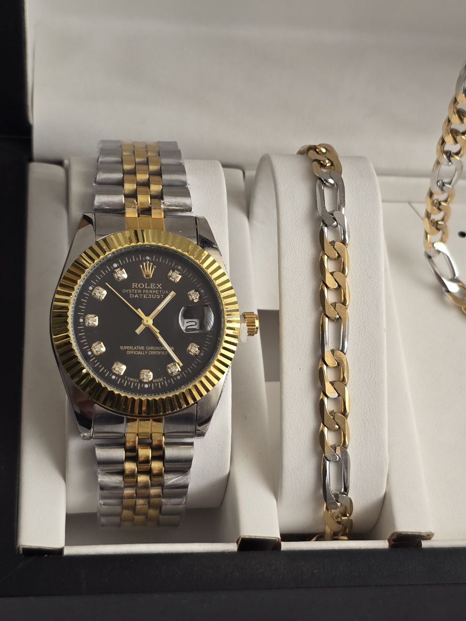 ست مردانه ساعت و دستبند و گردنبند استیل و حلقه( سایز ۶ تا ۱۰) بهمراه جعبه کادویی و باتری یدکی