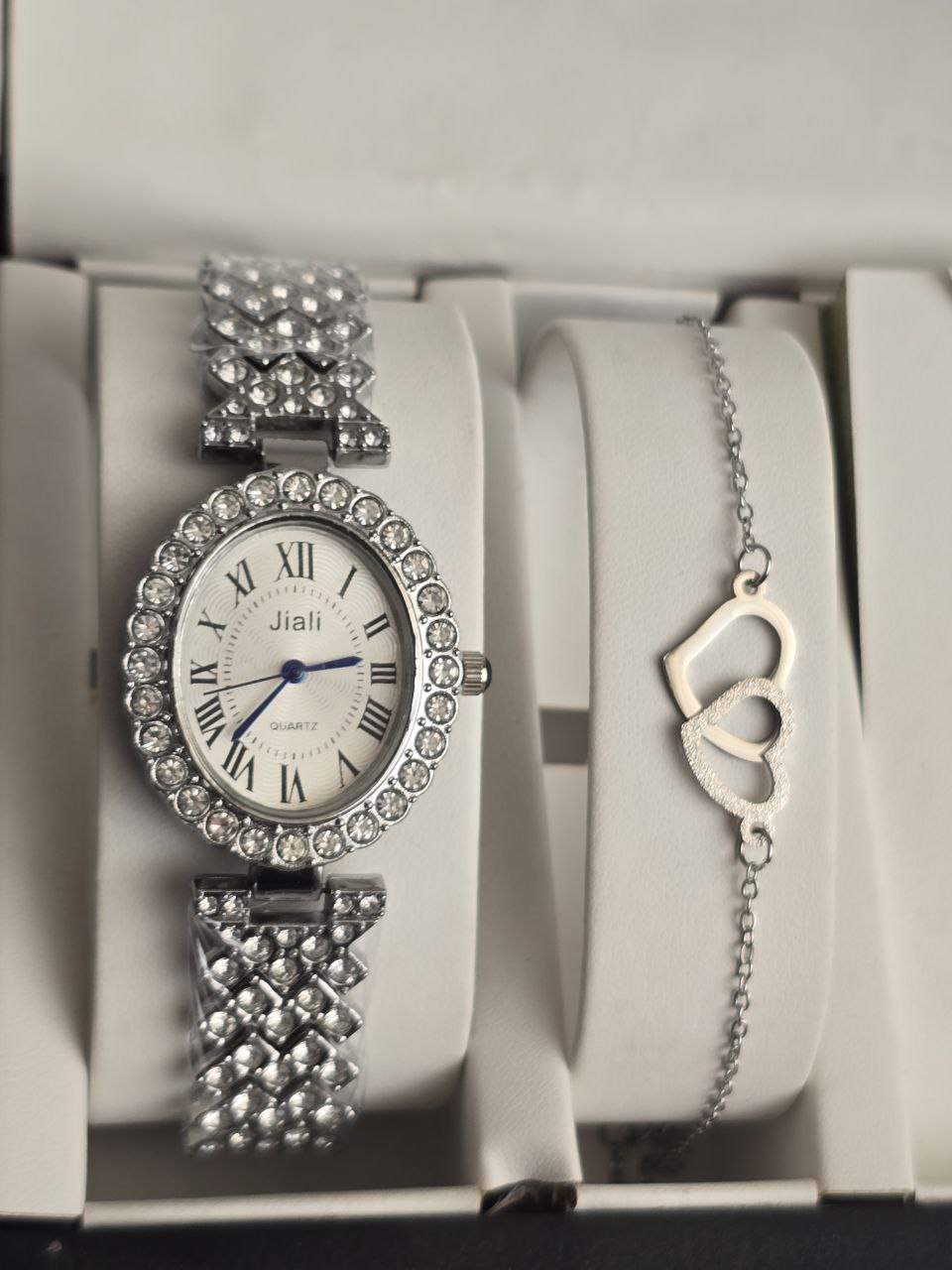 ست زنانه و دخترانه ساعت و دستبند و نیمست استیل و انگشتر جواهری بهمراه جعبه کادویی و باتری یدکی