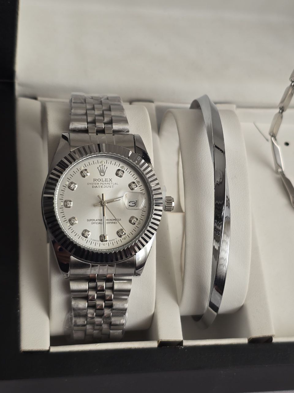 ست مردانه ساعت و دستبند و گردنبند استیل و حلقه( سایز ۶ تا ۱۰) بهمراه جعبه کادویی و باتری یدکی