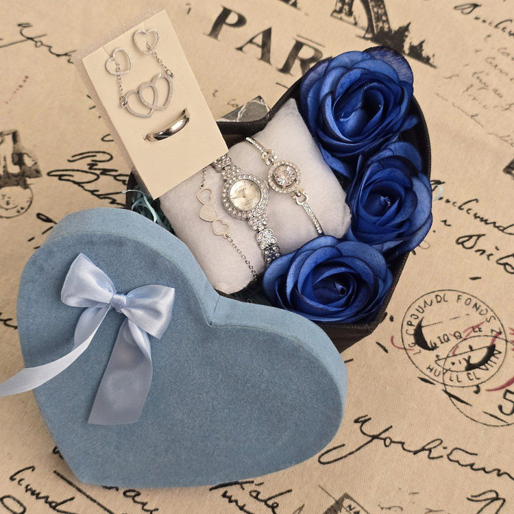 🔸️اقلام باکس: پک زنانه و دخترانه ساعت و دستبند و نیمست استیل و حلقه بهمراه باکس و گل مصنوعی