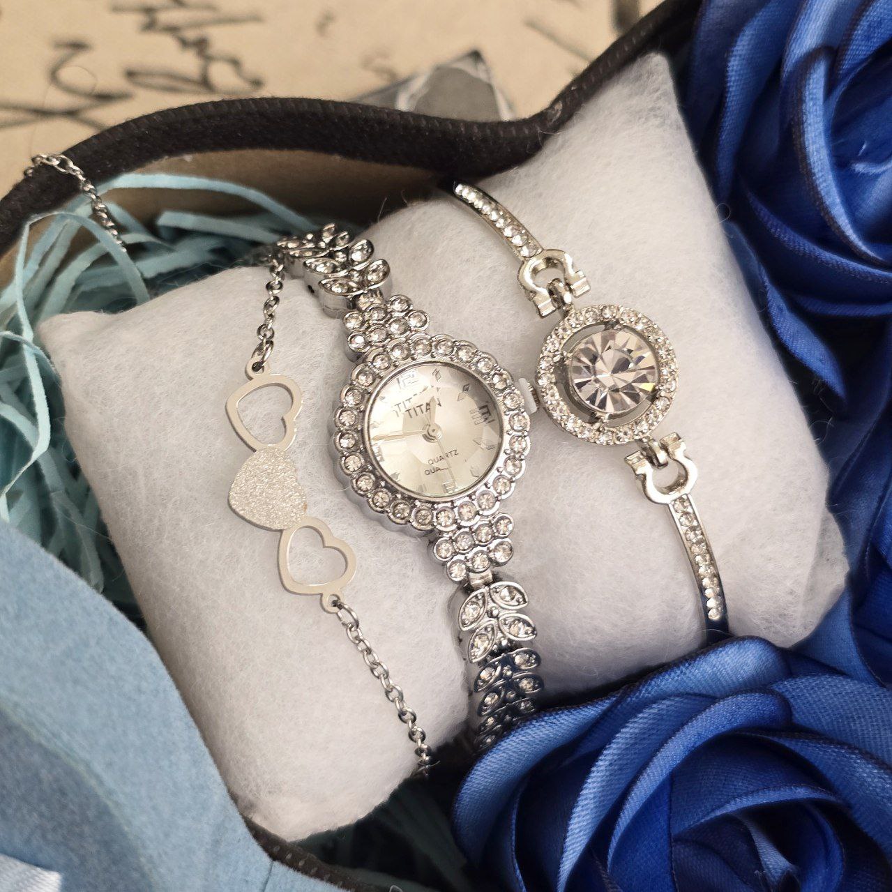 🔸️اقلام باکس: پک زنانه و دخترانه ساعت و دستبند و نیمست استیل و حلقه بهمراه باکس و گل مصنوعی