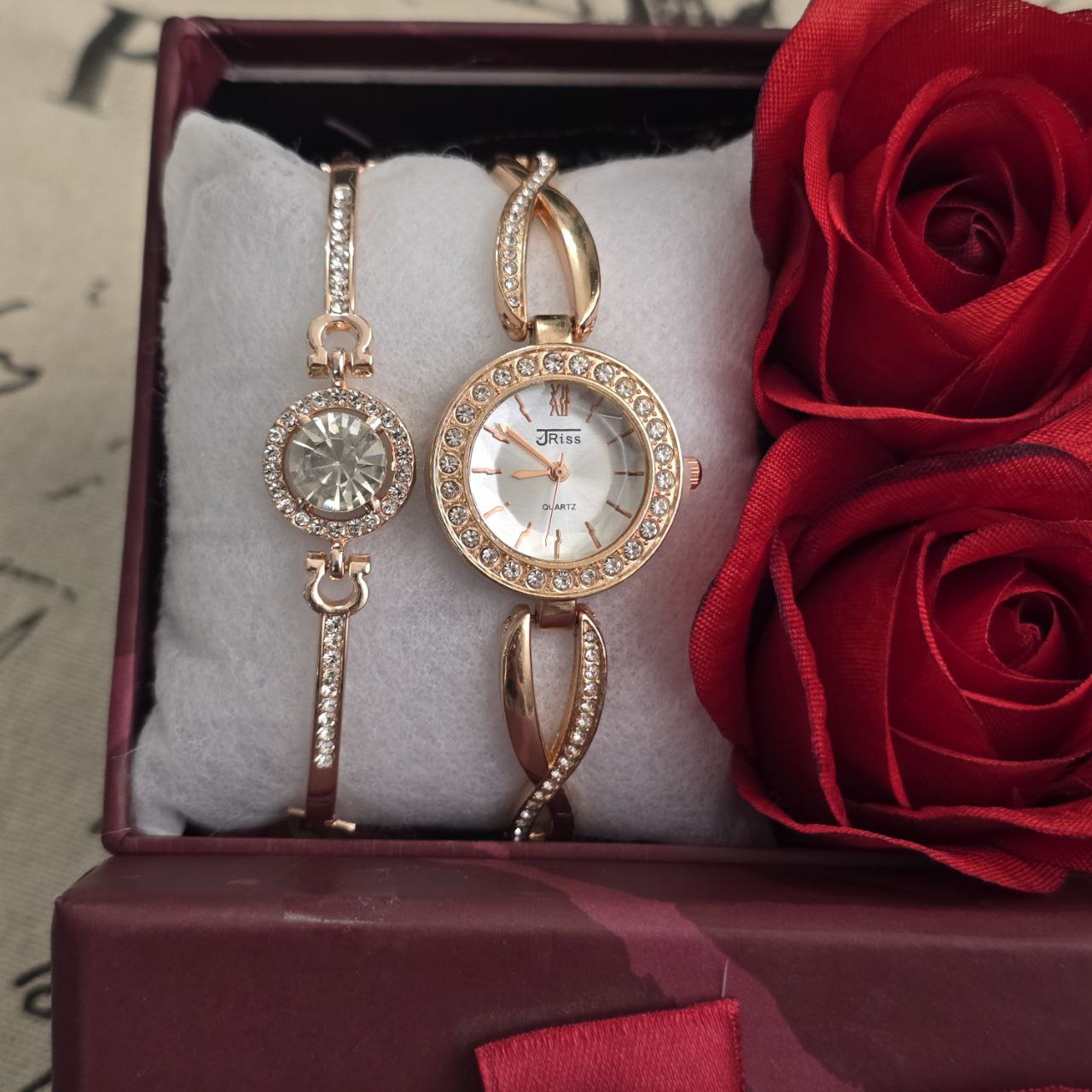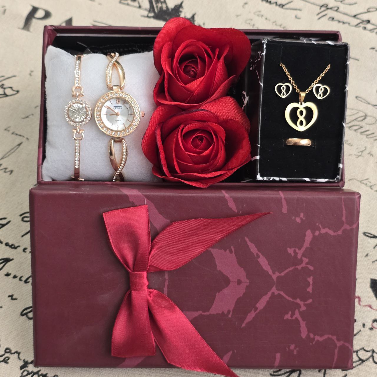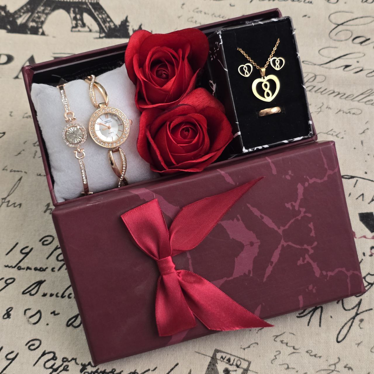 پک زنانه و دخترانه ساعت و دستبند و نیمست استیل و حلقه بهمراه باکس و گل مصنوعی