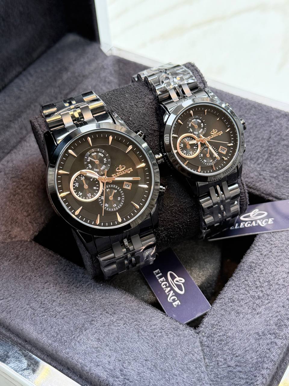 ست ساعت زنانه و مردانه مارک الگانس ELEGANCE Q1 125013501986 رنگ ثابت موتور ژاپن دو قفله مخفی دارای روز شمار طرح سه موتوره قاب و بند استیل کیفیت بسیار عالی همراه با جعبه شیک