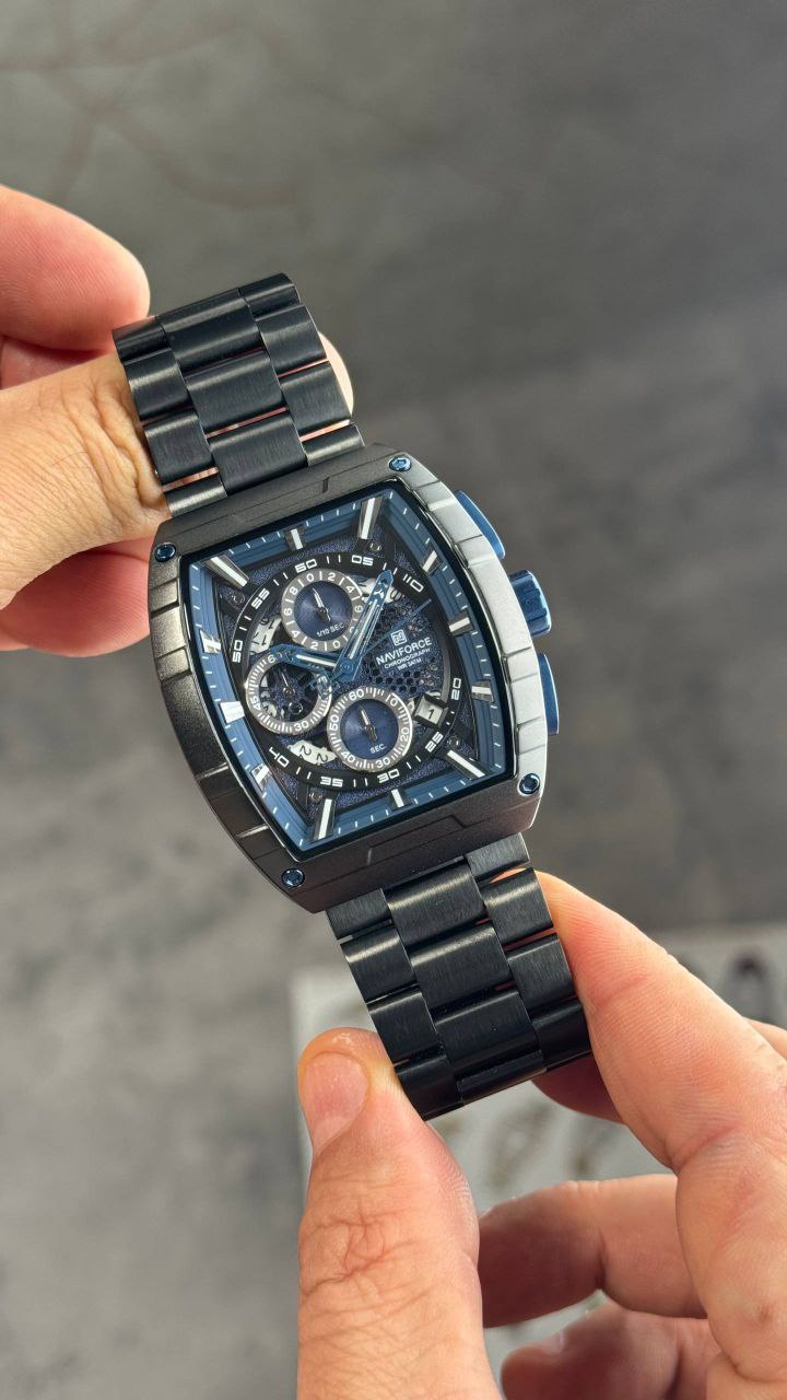 ساعت مردانه سه موتوره فعال برند ناوی فورس قطر ۴۵ میلی متر رنگ ثابت ضدآب قاب استیل بند استیل شیشه ضدخش روز شمار دارد ضدآب 3ATM باکس اصلی