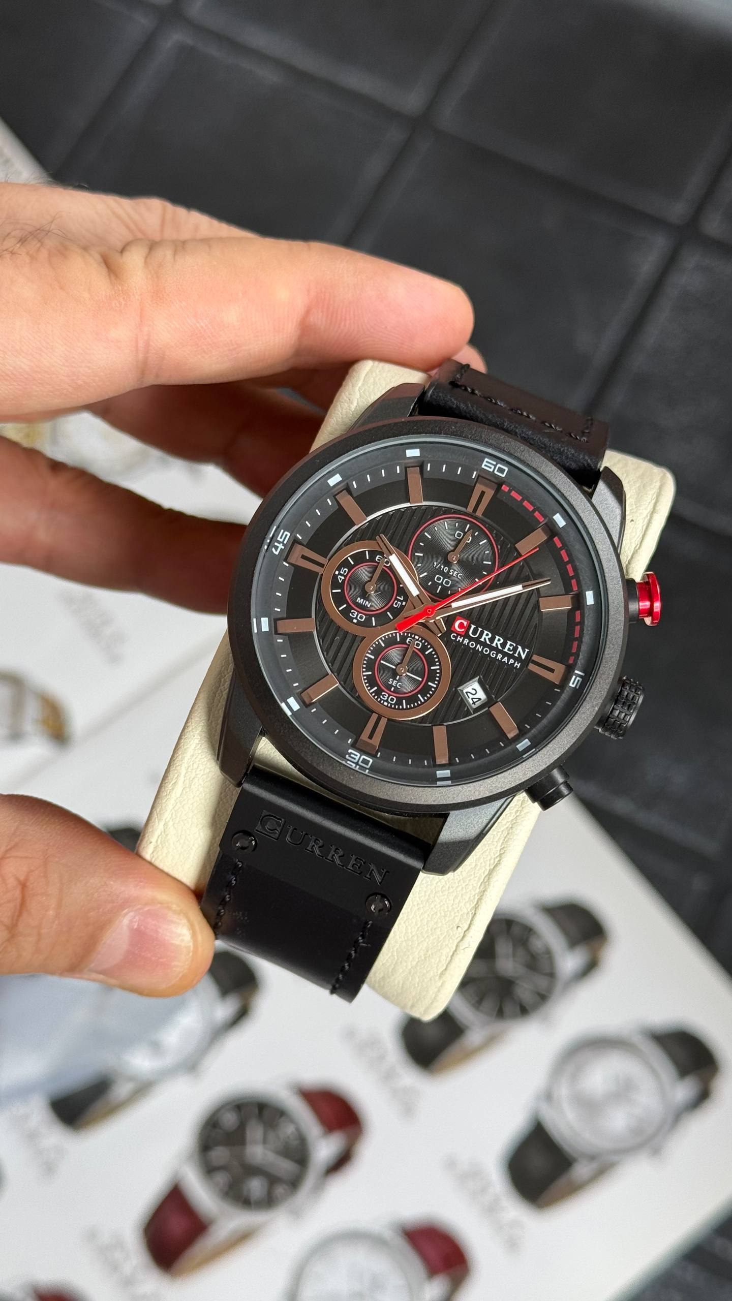 ساعت کارن مردانه قطر 45 میلی متر رنگ ثابت قاب استیل بند چرم شیشه ضدخش روز شمار داردbrand curren Model 8291