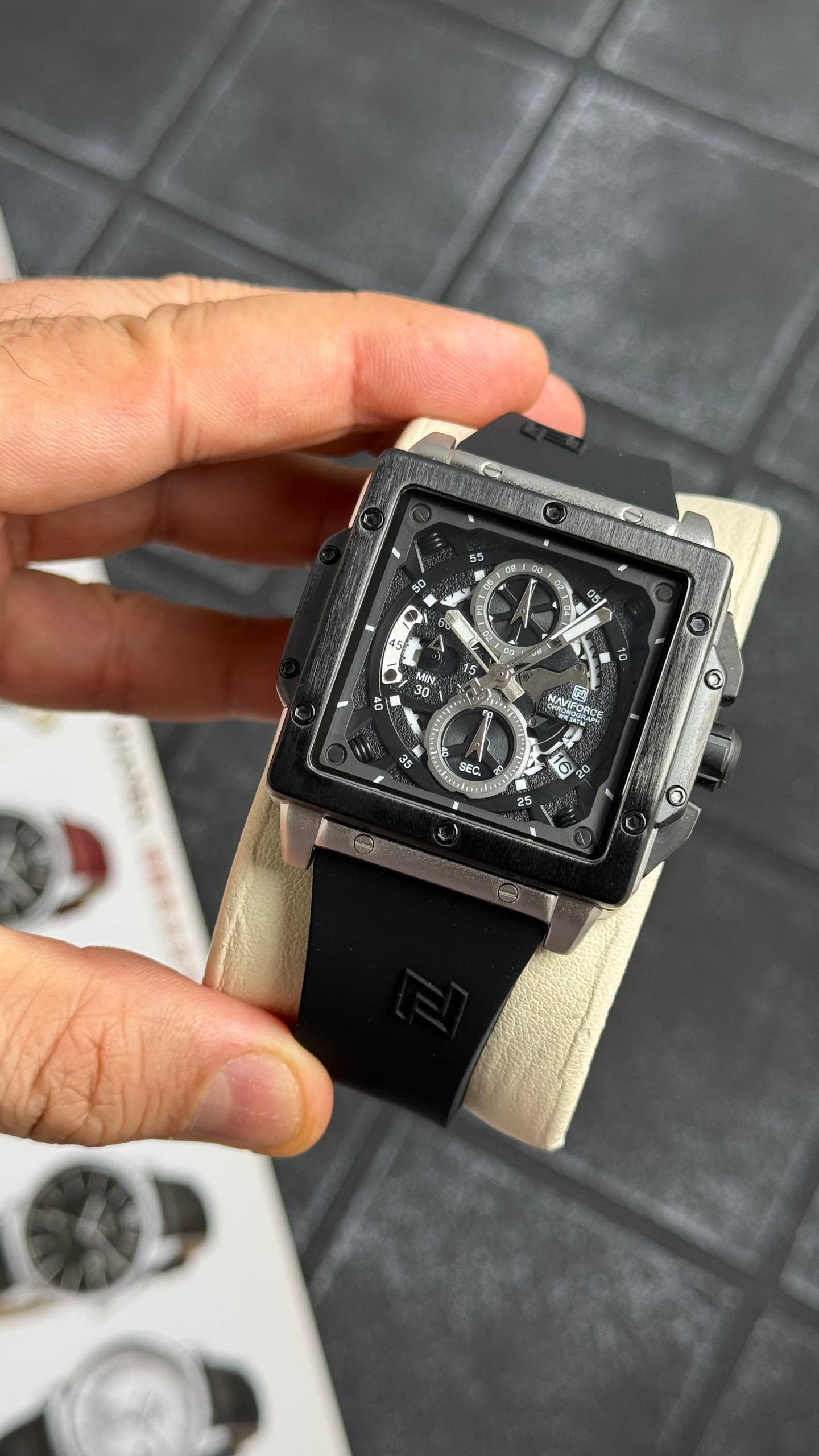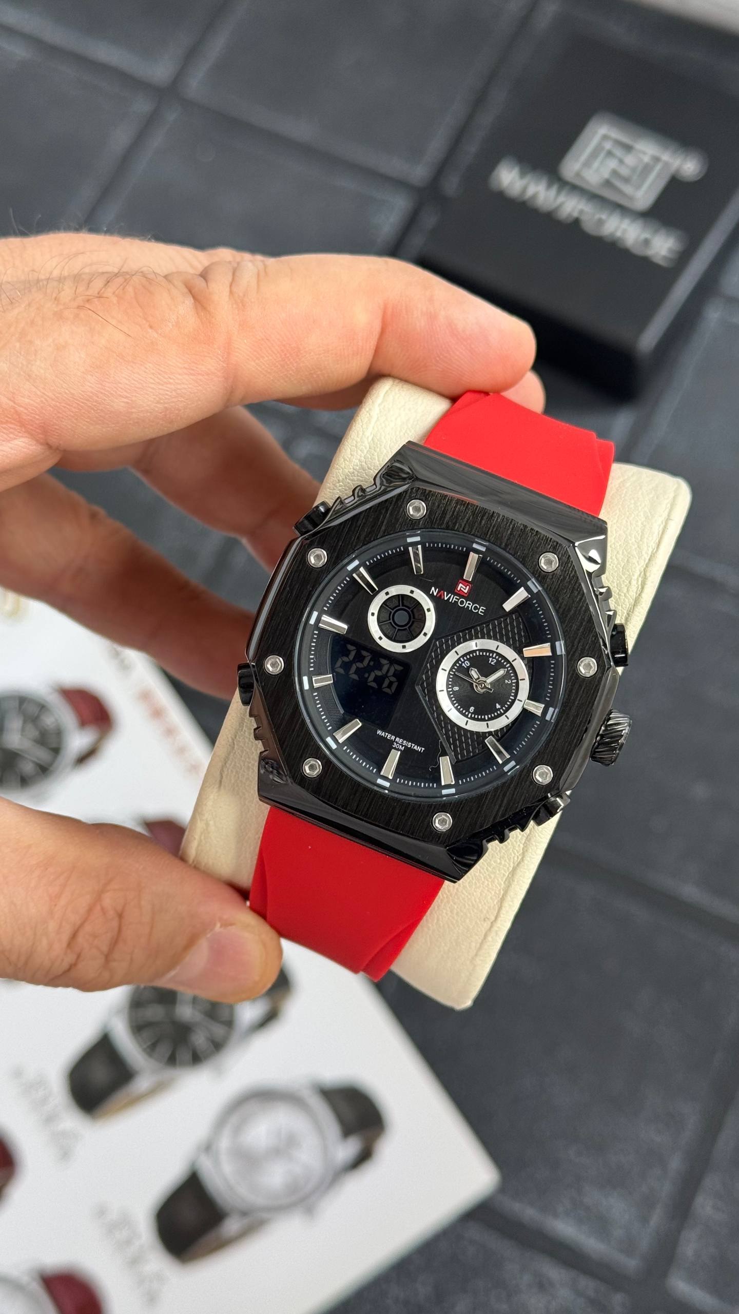 ساعت مردانه موتور ژاپن دو زمانه رنگ ثابت ضدآب بند سیلیکونی کیس استیل نمایش ایام هفته و روز شمار بک لایت آلارم کرنومترNaviforce Dual time