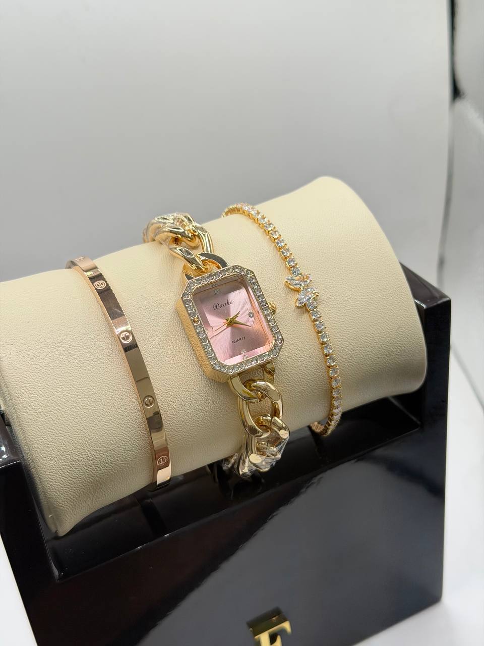ست زنانه و دخترانه ساعت نگینی بهمراه دو عدد دستبند نگین تنیسی و ونکلیف بهمراه جعبه کادویی و باتری یدکی