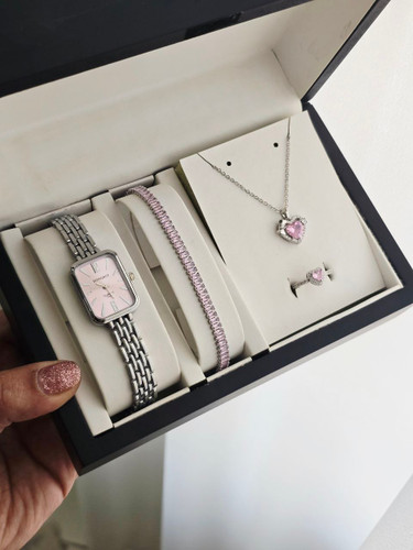 ست زنانه و دخترانه ساعت و دستبند و گردنبند و انگشتر بهمراه جعبه کادویی و باتری یدکی