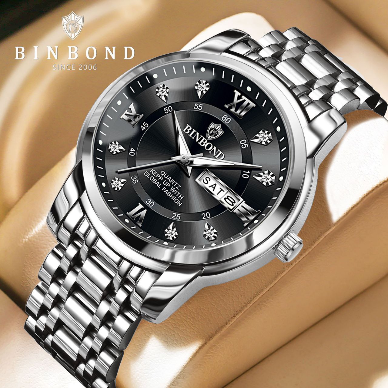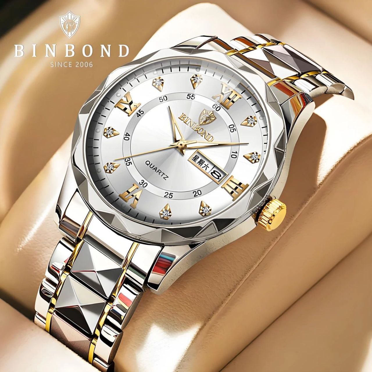 ساعت مردانه موتور کوارتز مقاوم در برابر آب طرح الماس دارای روز شمار ایام هفته صفحه شب نما بند فولاد استیل قفل پروانه ای استیل مخفی شیشه سافایر ضدخش