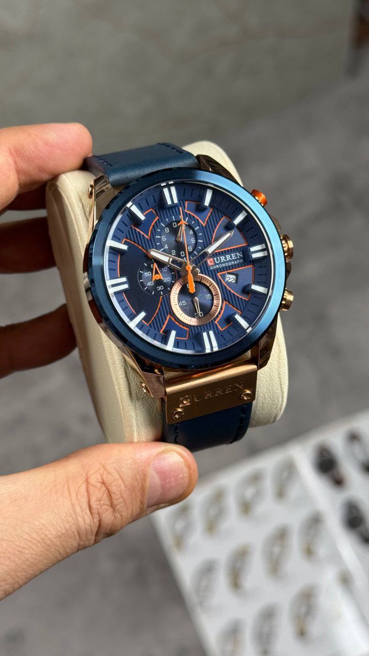 ساعت سه موتوره فعال برند کارن قطر ۴۵ میلی متر رنگ ثابت ضدآب قاب استیل بند چرم شیشه ضدخش روز شمار دارد ضدآب 3ATM باکس اصلی